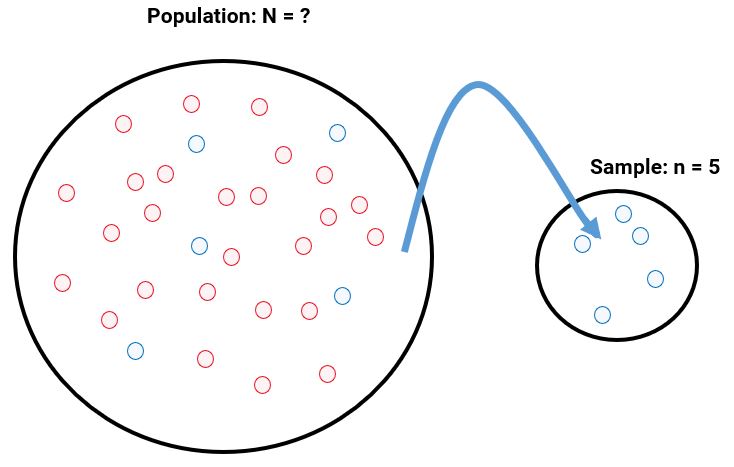 The above picture illustrates what is happening when we take a sample from a population. The population will have some number, \(N\), of units (these may be people or other members, elements, or subjects). Often, we don't know how many units a population consists of. We can then take a sample of \(n\) units - in the above diagram, we have \(n=5\). Often, samples are chosen randomly. We will learn more about sampling methods later on in this subject.